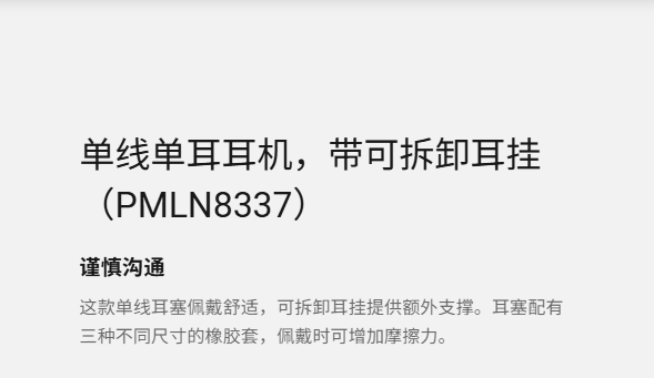 这款单线耳塞佩戴舒适,可拆卸耳挂提供额外支撑。耳塞配有三种不同尺寸的橡胶套,佩戴时可增加摩擦力。