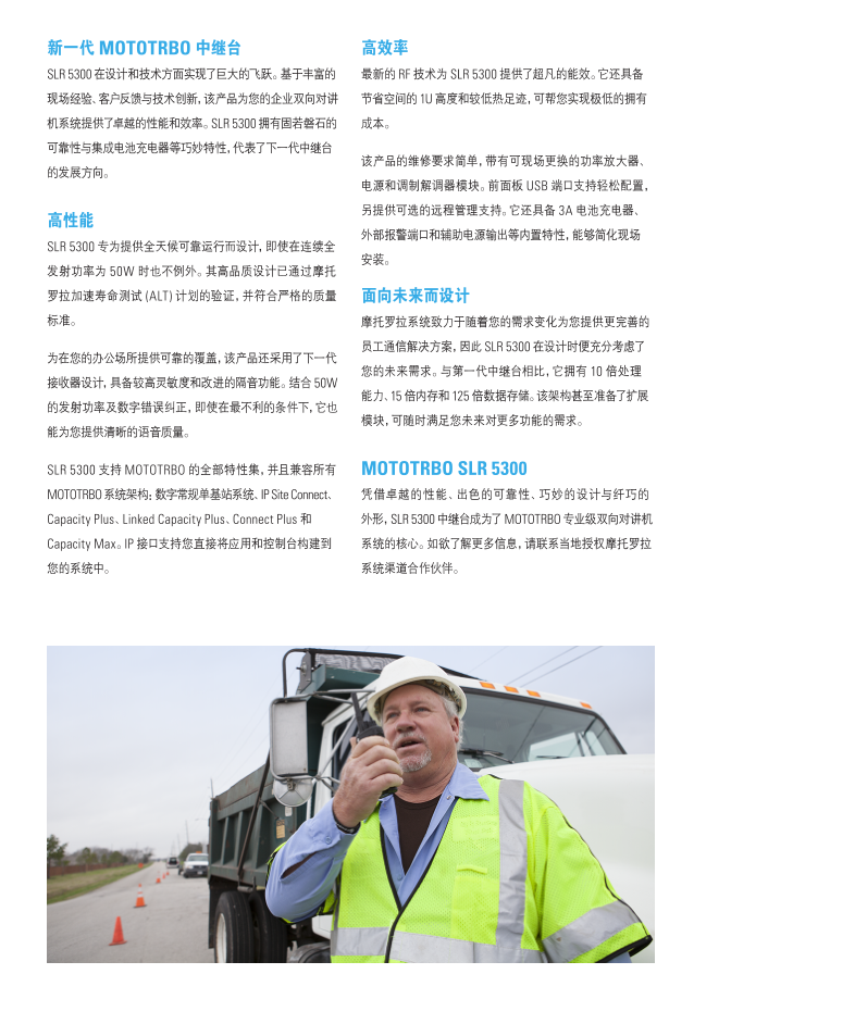 SLR 5300中继台在为客户提供全天候可靠运营,其高品质设计已通过摩托罗拉加速寿命测试 (ALT) 的验证,并符合严格的质量标准。为在您的工作场所提供可靠的覆盖,该产品还采用了下一代接收器设计,具备较高灵敏度和噪声抑制。即使在最严苛的条件下,它也能为您提供清晰的语音质量。
